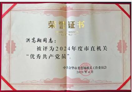 中共金华市委直属机关工作委员会授予洪高翔主任“优秀共产党员”荣誉称号