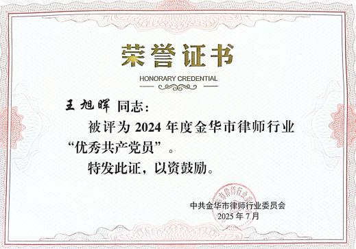 王旭晖同志被评为2024年度金华市律师行业“优秀共产党员”